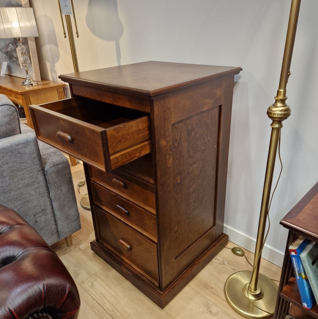 Skano täispuidust kummut viie mahuka sahtliga on praktiline ja ajatu valik nii magamistuppa, esikusse kui ka elutuppa. Tumepruun viimistlus toob esile kummuti soliidsuse ning sobitub hästi nii traditsioonilise kui ka modernsema interjööriga.